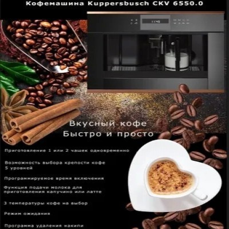 Кофемашина Kuppersbusch CKV 6550.0 ЖК-дисплей с текстовым и графическим полями Электронная система управления с сенсорными кнопками Программируемое количество кофе для 5 размеров чашек (эспрессо, малая, средняя, большая, высокая) Приготовление 1 или 2 чашек Функция подачи молока для приготовления капучино или латте Съемный контейнер для молока с функцией очистки Возможность использования кофейных зерен или молотого кофе Регулируемый по высоте раздатчик кофе Давление при заваривании 15 бар 3 температуры кофе на выбор Возможность выбора крепости кофе (5 предварительно заданных уровней) Отдельные нагреватели для заваривания кофе и приготовления горячей воды Программа удаления накипи Автоматическое ополаскивание при включении и отключении Емкость для воды заполняется спереди Электронный таймер с белыми индикаторами Программируемое время включения Режим ожидания Телескопические направляющие для легкого заполнения кофемашиныПодсветка чашекНаблюдение доставляет удовольствие - хорошо известный факт. Светодиодная подсветка преподносит только что сваренный кофе в правильном свете. И приготовление кофе становится хорошей традициейЕмкость для свежей водыДуховые шкафы и кофемашины Kuppersbusch легко встраиваются в любую кухонную мебель, так как благодаря наличию емкости для свежей воды подсоединение к водопроводу не требуютсяХарактеристики:Потребляемая мощность: 1,35 кВт (вилка Schuko)Размеры прибора (Ш x В x Г): 595 x 455 x 475 мм (вкл. фасад 20 мм и телескопические направляющие) Размеры ниши (Ш x В x Г): 560 x 450 x 550 мм